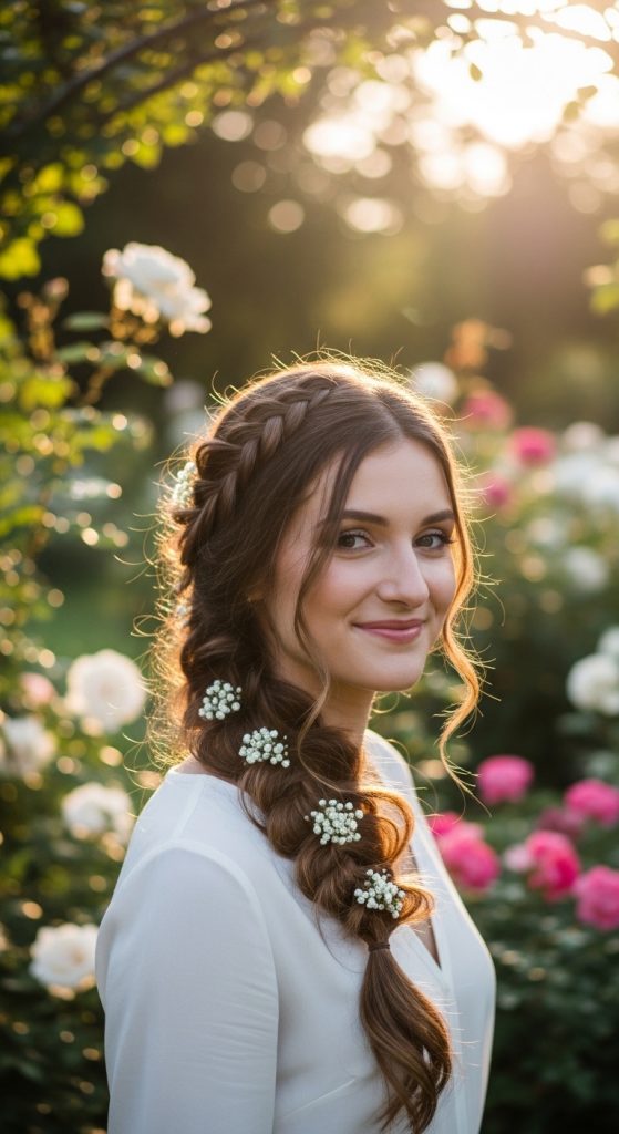 A side braid is simple yet elegant. Sweep your hair to one side and braid it loosely for a soft, feminine look. This style is perfect for both day and evening wear and works well with slightly messy textures.