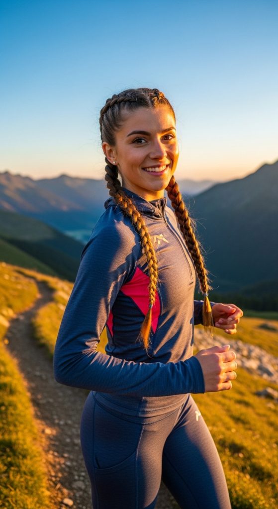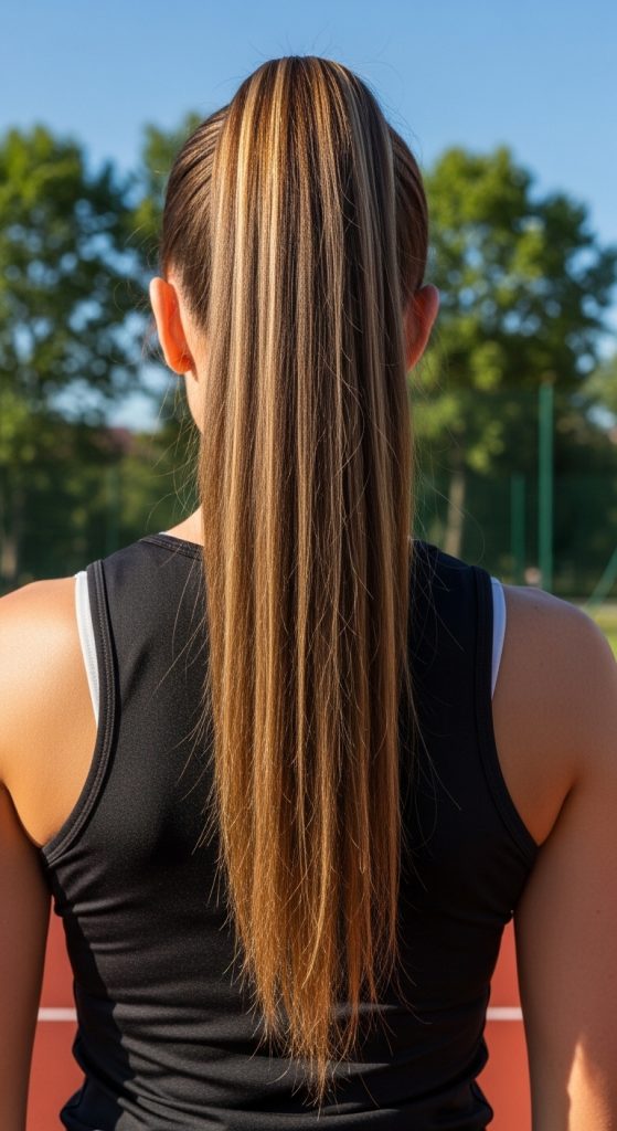 A high ponytail is both practical and stylish. It pulls your hair away from your face, helping you stay cool while giving a sleek, sporty appearance. You can wrap a small section of hair around the elastic to elevate the look.