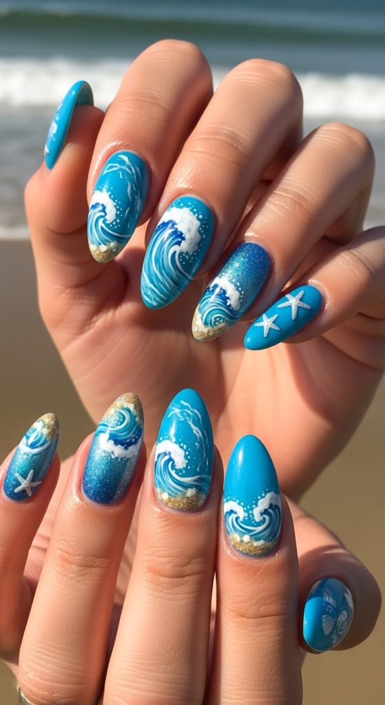 Bring beach vibes to your fingertips with ocean-inspired nails. Think shades of blue, wave patterns, and shimmer effects that resemble water.