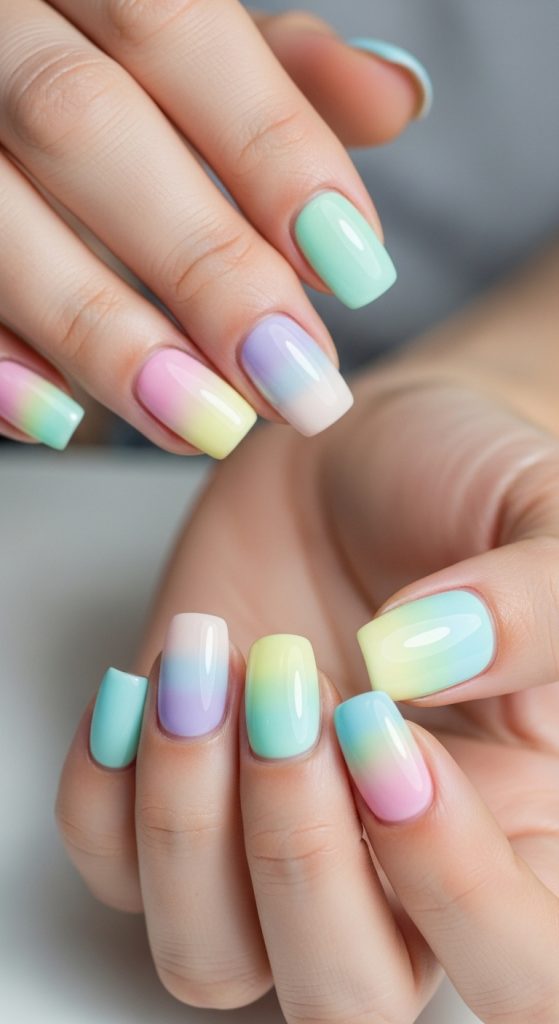 Pastel shades never go out of style during summer. Soft colors like baby pink, mint green, lavender, and sky blue create a dreamy rainbow effect. You can paint each nail a different pastel shade or blend them in an ombré style.