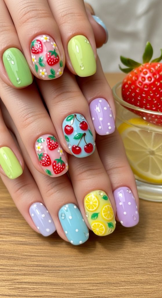 Cute fruit designs like strawberries, cherries, lemons, and watermelons are trending this summer. These designs bring a fresh and fun vibe to your nails.