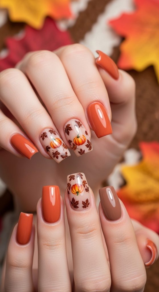 Orange is a quintessential fall color, and pumpkin spice shades are trending in nail art. Think warm burnt oranges and soft terracotta hues. Pair these shades with tiny leaf or pumpkin decals for a playful yet seasonal vibe. This design works particularly well on square or coffin-shaped nails.