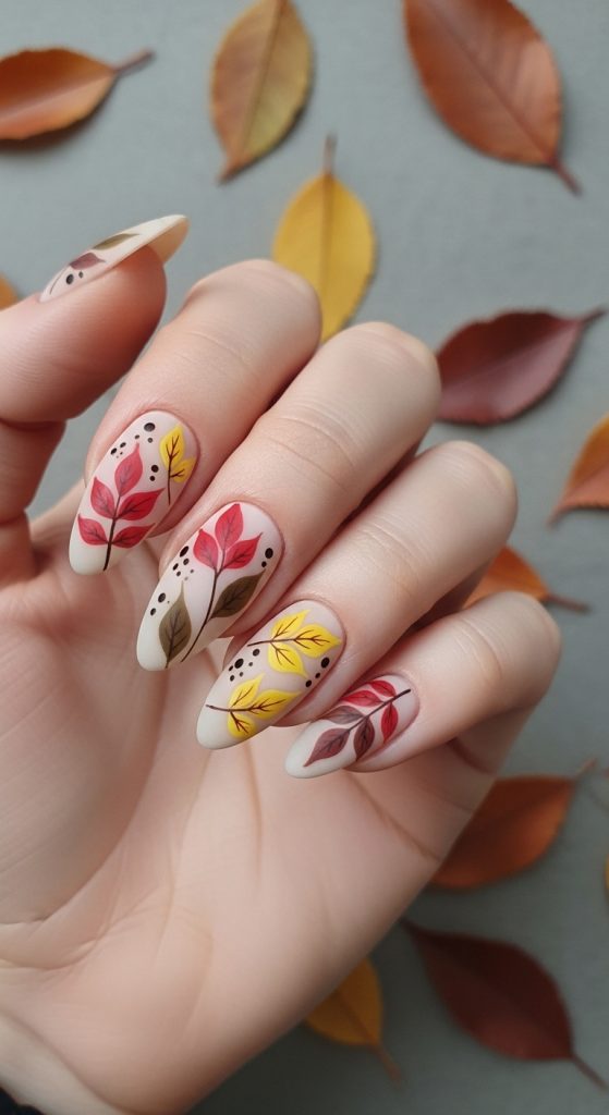 Fall is synonymous with changing leaves, so why not bring nature to your nails? Leaf motifs in red, yellow, and brown tones create a delicate seasonal design. Use fine brushes to paint tiny leaves, or try stamping for a more precise look. Even minimalistic single-leaf accents on neutral nails can feel festive and cozy.
