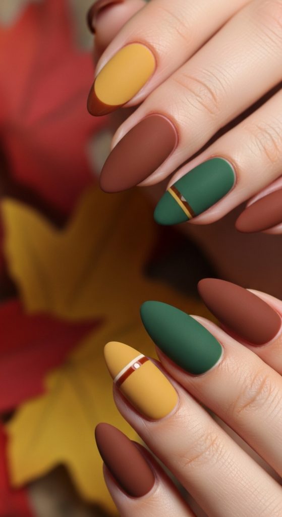 Matte nails are a chic way to give depth and sophistication to any color. Fall shades like chocolate brown, deep green, or muted mustard look particularly striking in matte. You can also mix matte and glossy finishes, such as glossy tips over a matte base, for a subtle yet modern twist.