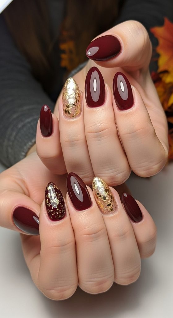 Rich, dark reds and wine shades are classic fall favorites. They add elegance and sophistication to any outfit. For an extra twist, try a gradient effect that transitions from burgundy to a lighter red or blush tone. Accents like gold flakes or subtle shimmer can elevate this look for evening occasions.