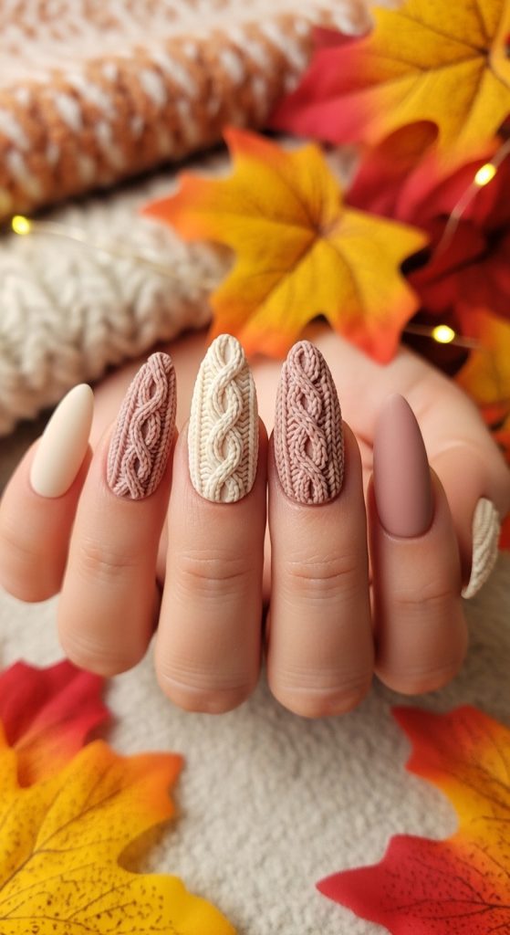 Sweater-inspired nail art is the ultimate cozy trend. Using textured gels, create cable-knit or ribbed patterns on an accent nail to mimic the feel of a chunky knit sweater. Pair with matte neutral tones or soft warm colors to complete the autumnal aesthetic. This 3D effect adds depth and uniqueness to your fall manicure.