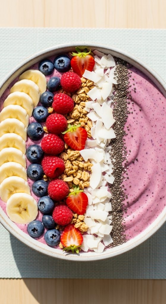 Blend frozen fruits like bananas and berries with a little milk or yogurt until thick. Pour into a bowl and top with granola, nuts, and seeds. It feels like a treat but is actually very nutritious and refreshing.