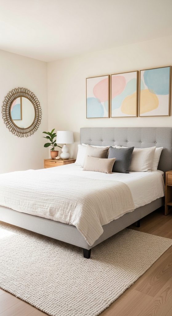 Even minimalist spaces need personality. Use simple wall art or a decorative mirror to enhance the room without cluttering it. Choose art pieces with soft colors, abstract designs, or minimal frames. Mirrors can also make the bedroom feel bigger and reflect natural light, brightening the space for spring.