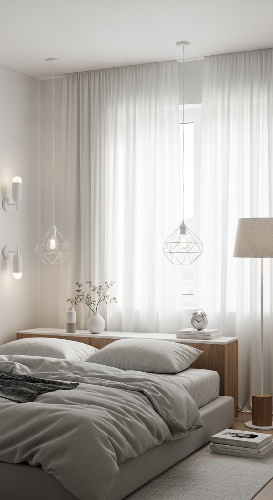 Lighting can dramatically change the atmosphere of your bedroom. Choose simple, sleek lighting fixtures like pendant lights, wall sconces, or minimalist floor lamps. Avoid bulky lamps with heavy shades. Natural light is also essential, so keep window treatments light and airy—think sheer curtains or blinds that let sunlight flood the room.