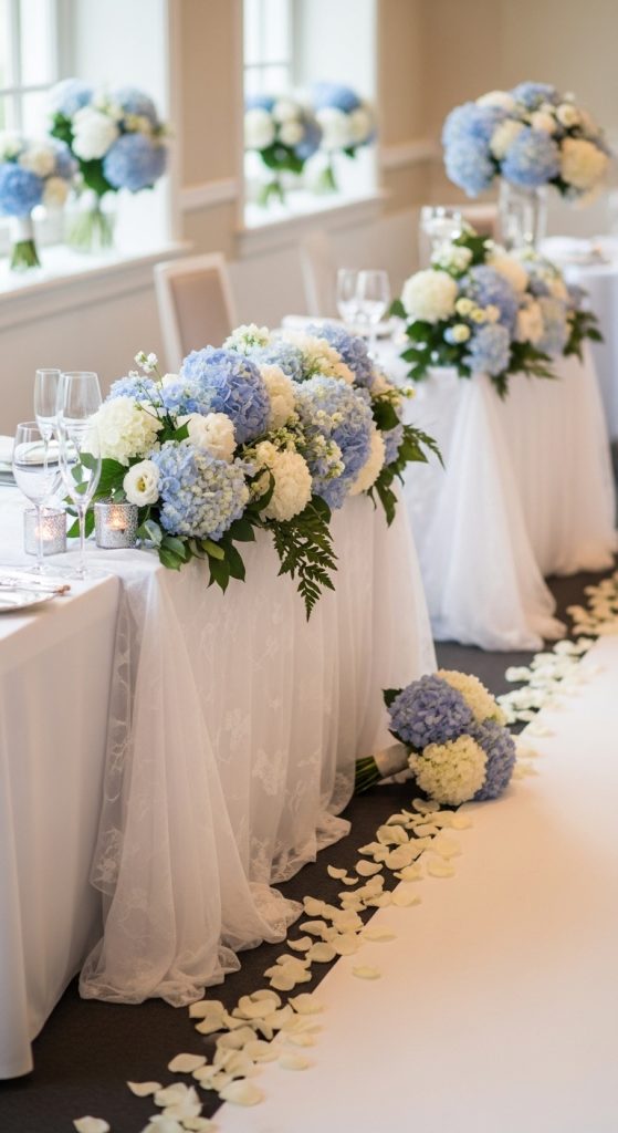 Flowers like hydrangeas, delphiniums, and white roses can be used to design beautiful bouquets and centerpieces. Adding silver accents can enhance the overall look.