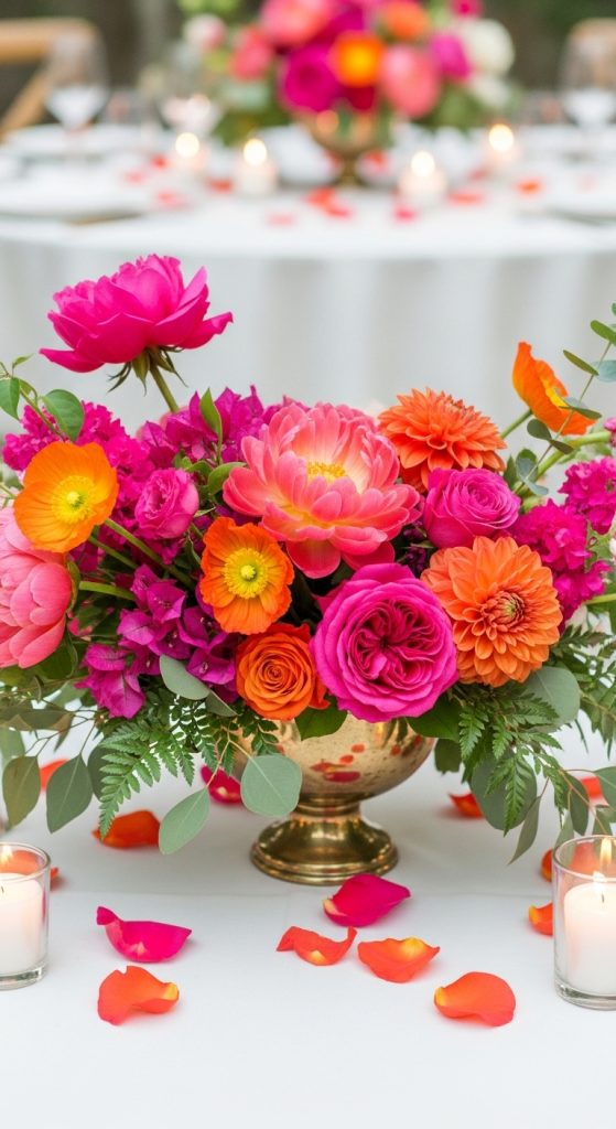 Use flowers like garden roses, dahlias, and carnations in these shades to create eye-catching arrangements. Adding hints of cream or soft pink can balance the brightness beautifully.