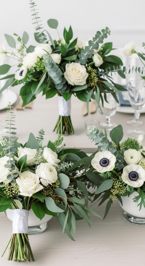 For a clean and modern look, white and green is an unbeatable combination. This palette focuses on simplicity and natural beauty. White flowers like roses, orchids, and hydrangeas paired with lush greenery create a fresh and elegant vibe.